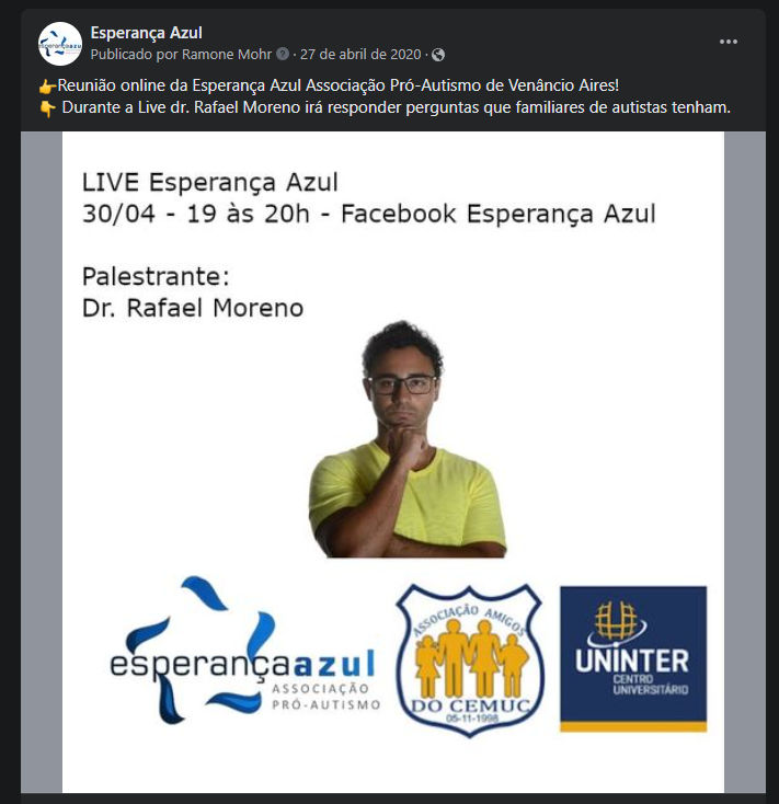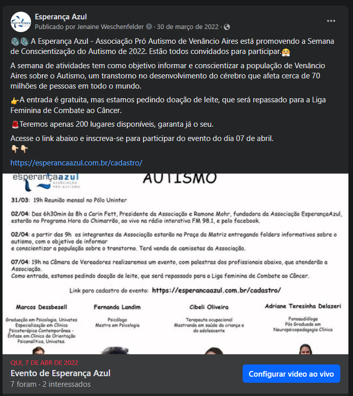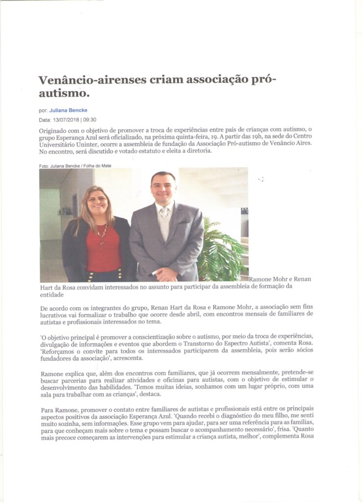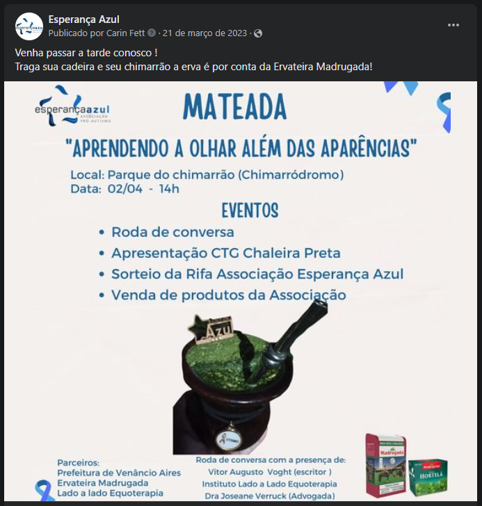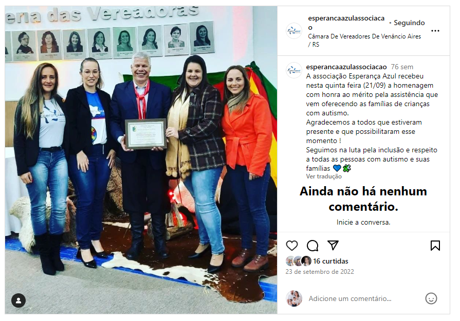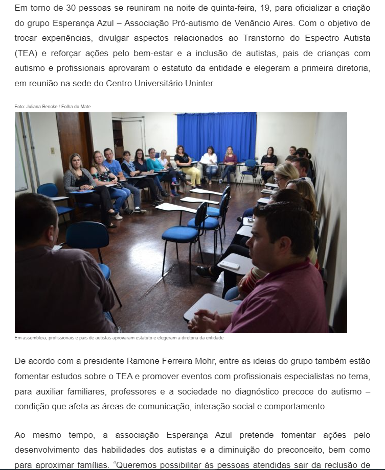 Associação Pró-Autismo de Venâncio Aires, criada por pais que querem promover o bem-estar, a proteção, o desenvolvimento pessoal e a inclusão das pessoas que estejam no espectro autista.